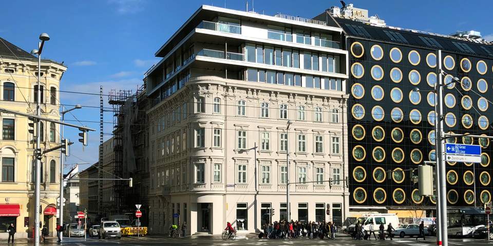 Das historistische Gebäude am Gürtel, nahe dem Wiener Hauptbahnhof, erhielt eine zweieinhalbgeschossige Aufstockung und einen modernen Dachausbau. Die Kombination aus historistischer und moderner Architektur fügt sich ansprechend in das urbane Umfeld – bestehend aus Historismus, 50er-Jahre-Stil und moderner Architektur – ein.